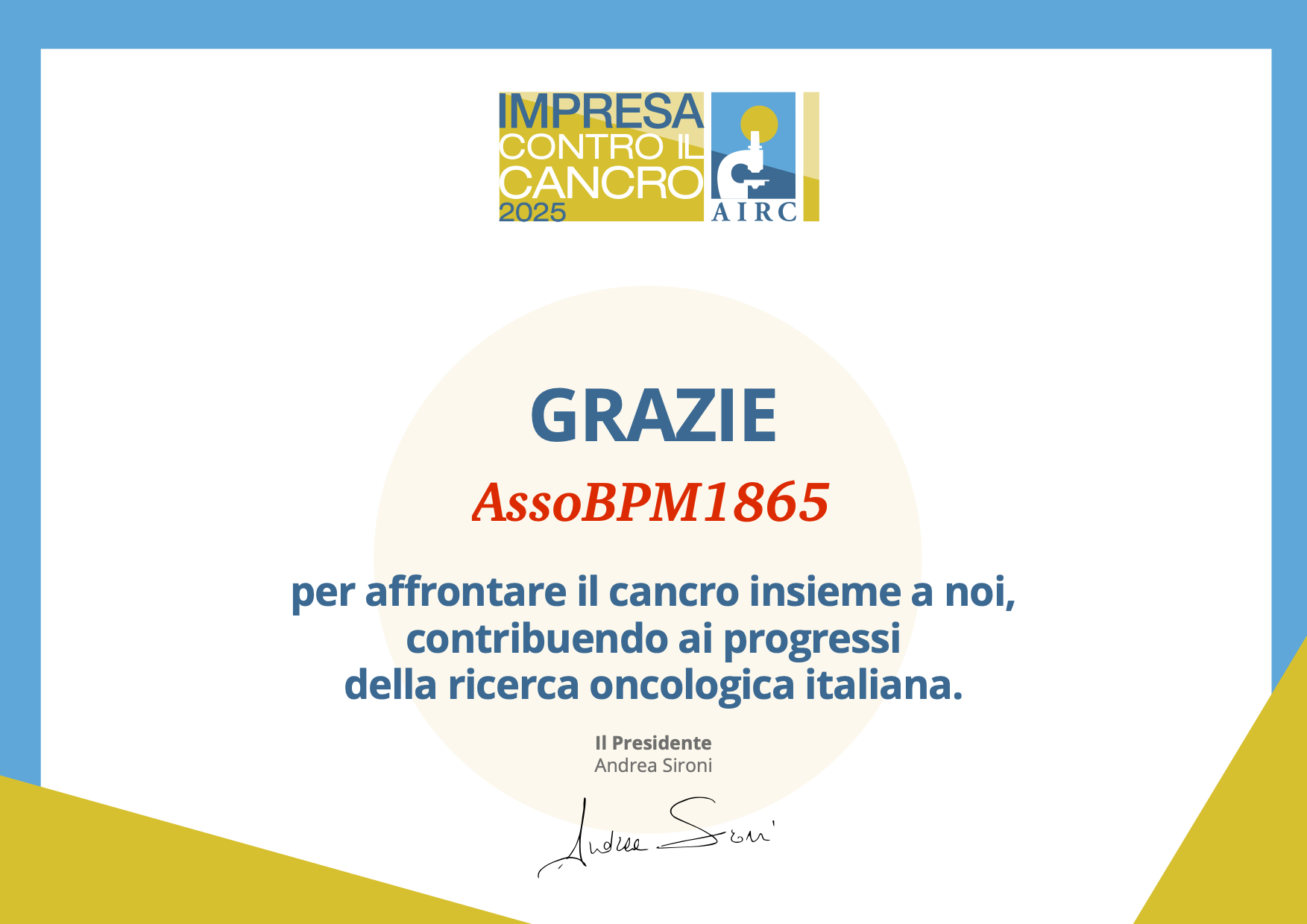Gli importi sono ovviamente liberi, ma, per semplicità amministrativa, proponiamo i seguenti scaglioni: € 35 - 50 - 70 - Altro Il Beneficiario è: AssoBPM1865 - Banco BPM L’IBAN: IT 44C 0 5 0 3 4 01650 0 0 0 0 0 0 0 13495 La Causale: Contributo 2026
